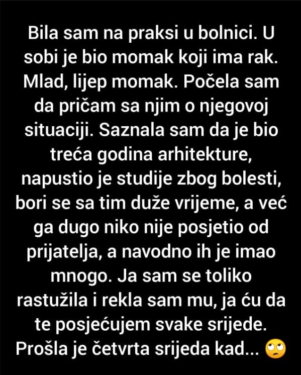 Bila sam na praksi u bolnici. U sobi je bio momak koji ima rak. Mlad, lijep momak. Počela sam da pričam sa njim o njegovoj situaciji. Saznala sam da je bio treća godina arhitekture, napustio je studije zbog bolesti, bori se sa tim duže vrijeme, a već ga dugo niko nije posjetio od prijatelja, a navodno ih je imao mnogo. Ja sam se toliko rastužila i rekla sam mu, ja ću da te posjećujem svake srijede.