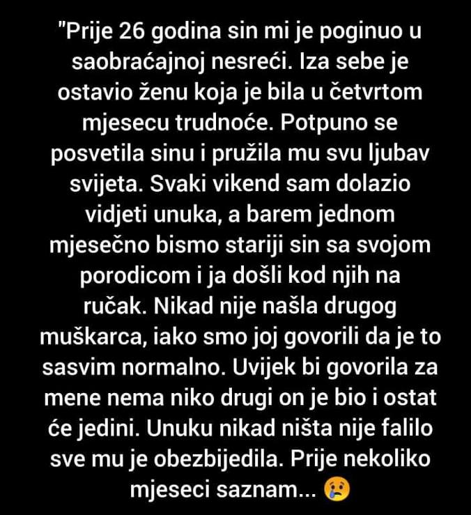 “Prije 26 godina izgubio sam sina u tragičnoj saobraćajnoj nesreći. Njegova supruga, koja je bila trudna u četvrtom mjesecu, ostala je sa svim našim uspomenama i ljubavlju koja se nije ugasila.