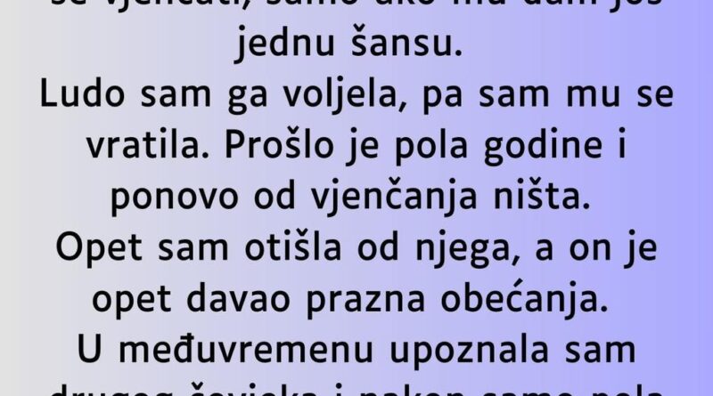 “Hodala sam s momkom deset godina. Nikako da me zaprosi. Kad sam se umorila od čekanja i prekinula s njim, obećao je da ćemo se vjenčati, samo ako mu dam još jednu šansu.