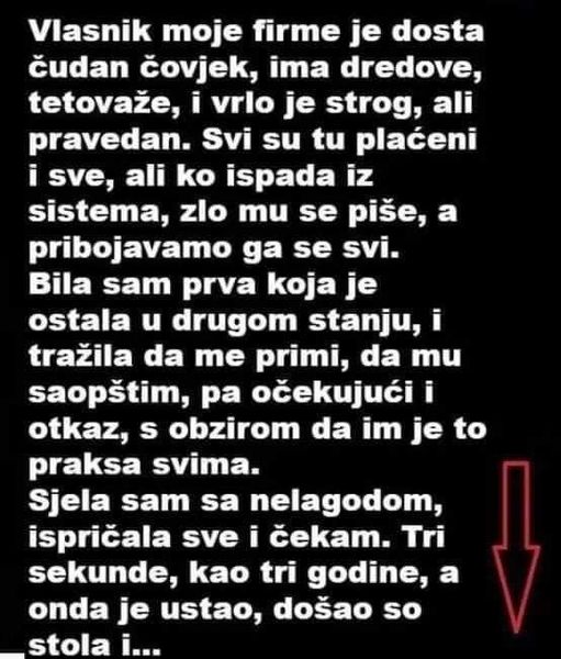 Bila sam prva koja je ostala u drugom stanju, i tražila da me primi, da mu saopštim, pa očekujući i otkaz, s obzirom da im je to praksa svima.