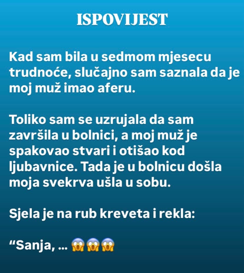 Kad sam bila u sedmom mjesecu trudnoće, slučajno sam saznala da je moj muž imao aferu. Toliko sam se uzrujala da sam završila u bolnici, a moj muž je spakovao stvari i otišao kod ljubavnice. Tada je u bolnicu došla moja svekrva ušla u sobu. Sjela je na rub kreveta i rekla: “Sanja, nikad te nisam voljela, naš odnos nije dobar. Ali mislim da je ono što je moj sin učinio odvratno.