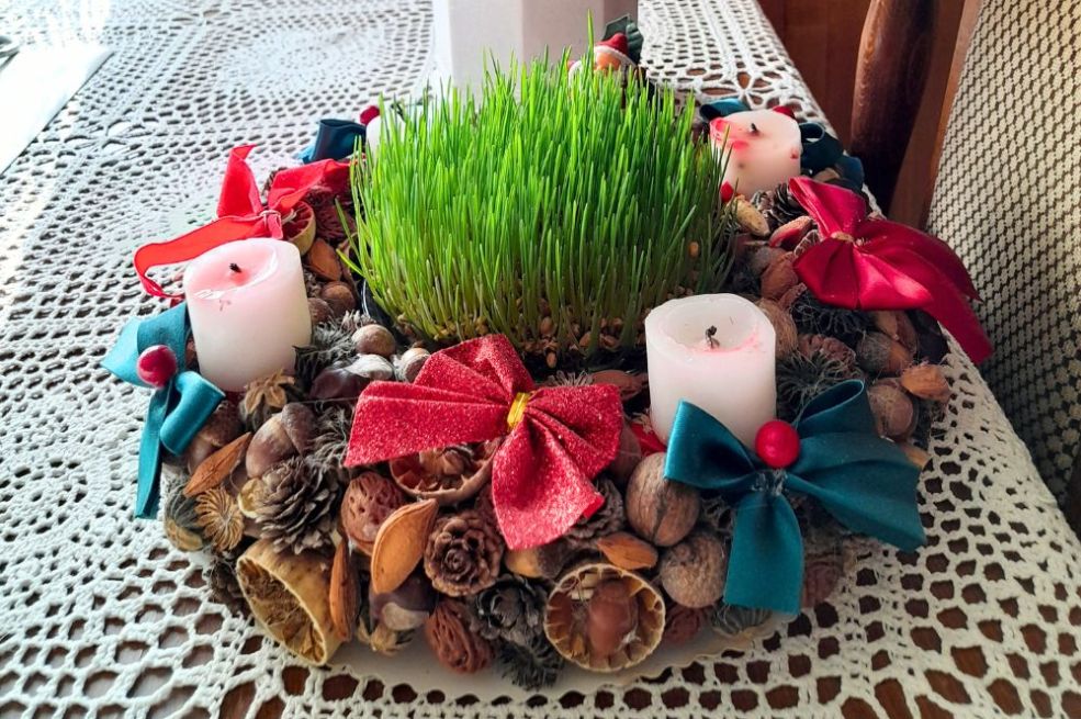 Izraslu pšenicu, prije nego što je stavite na sto, možete makazama ošišati da bi bila ljepša i uredna. Postavite svijeću u sredinu, a potom okolo vežite crvenom mašnom.