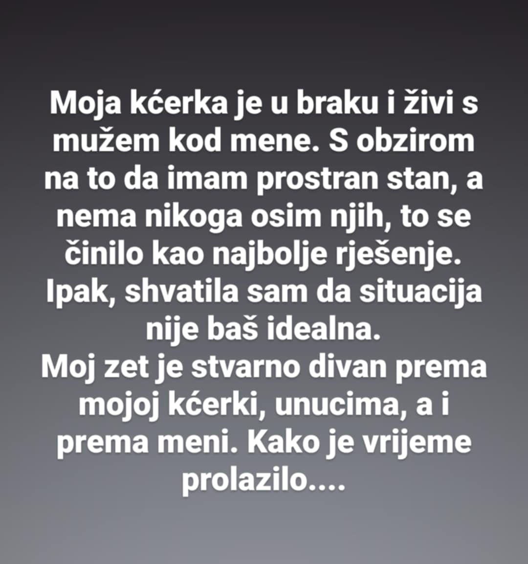 Moj zet je stvarno divan prema mojoj kćerki, unucima, a i prema meni. Kako je vrijeme prolazilo, jako sam se zbližila s njim i prirastao mi je srcu.