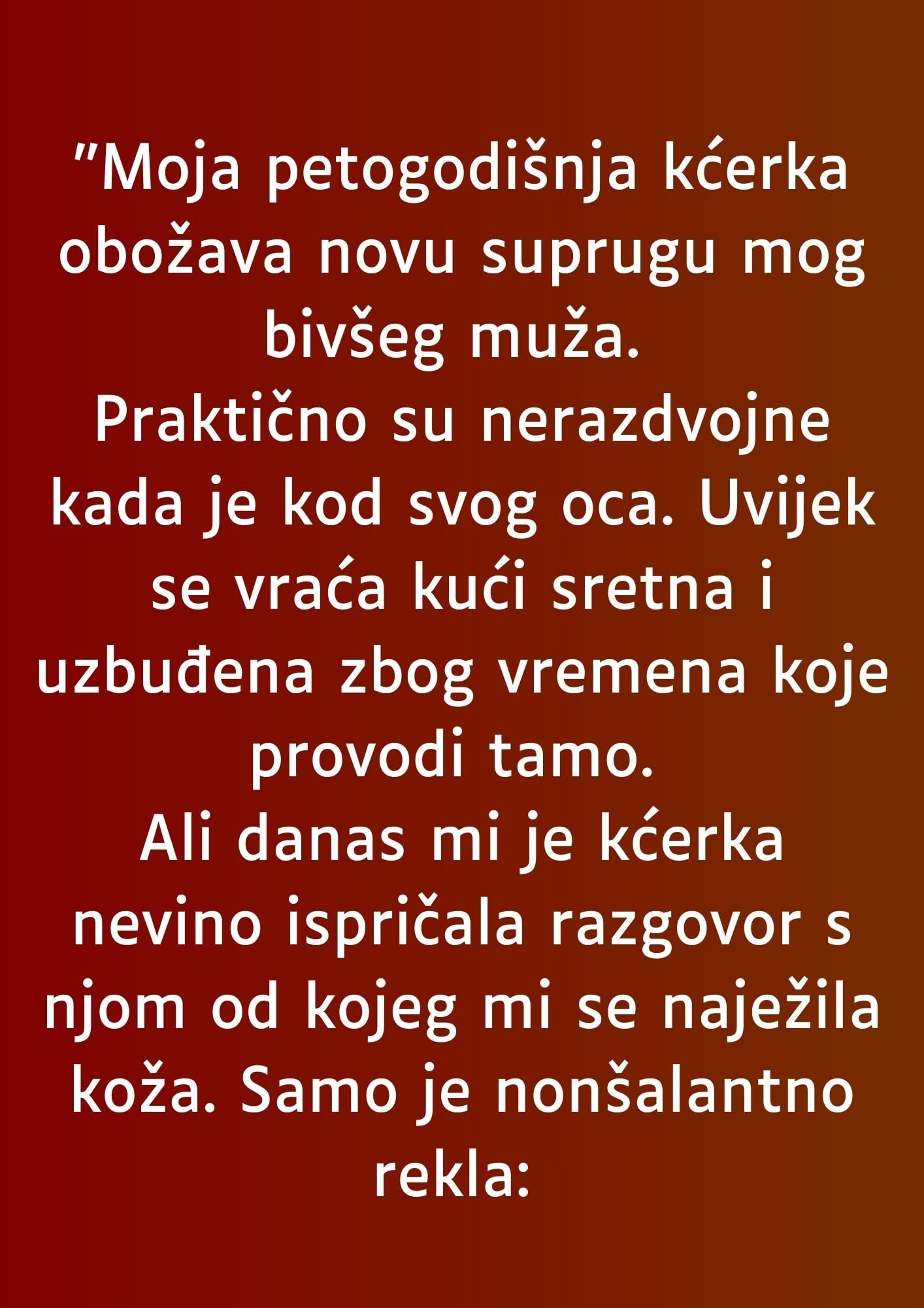 Read More“Moja petogodišnja kćerka obožava novu suprugu mog bivšeg muža. Praktično su nerazdvojne kada je kod svog oca. Uvijek se vraća