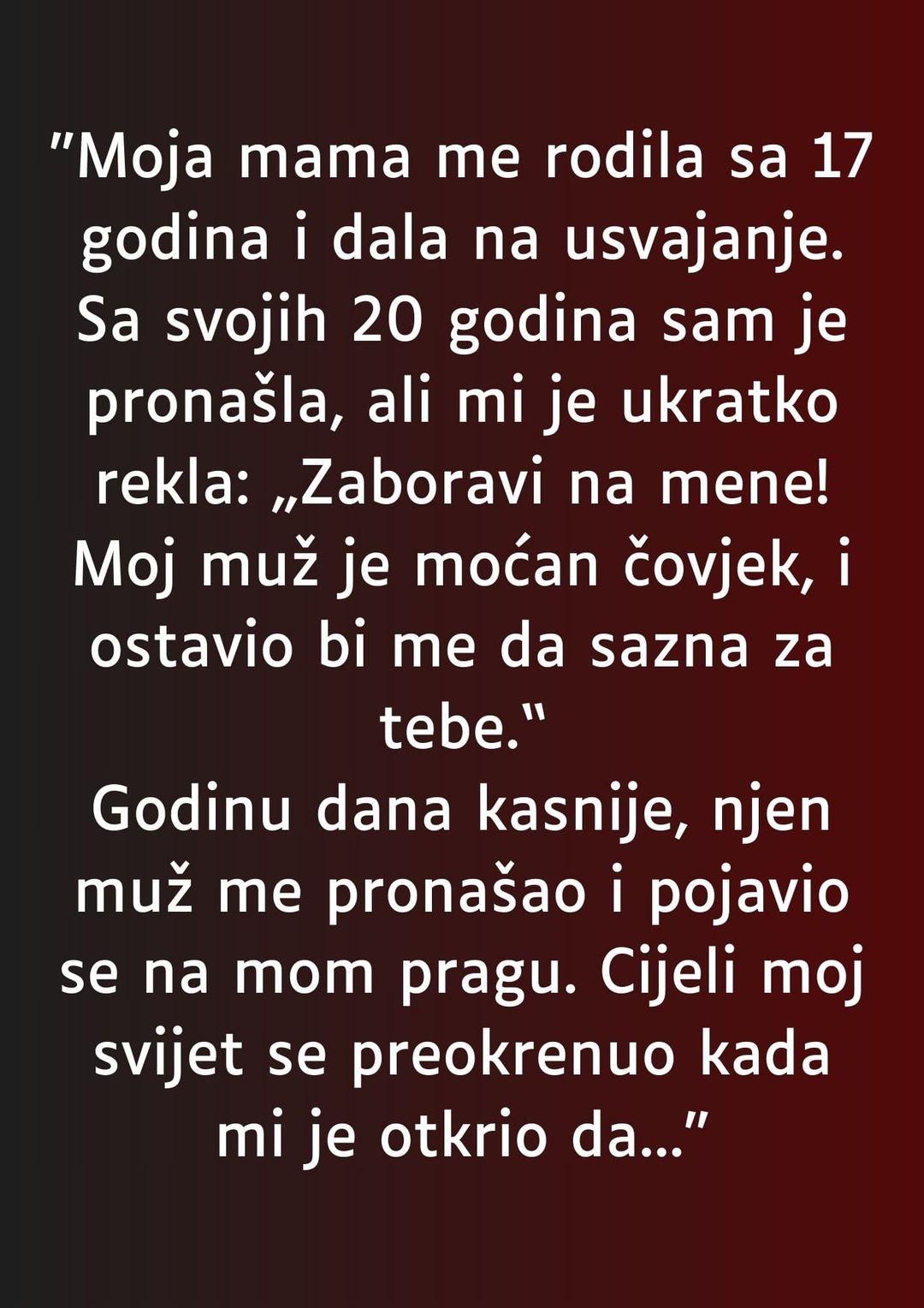 Read More“Moja mama me rodila sa 17 godina i dala na usvajanje. Sa svojih 20 godina sam je pronašla, ali mi