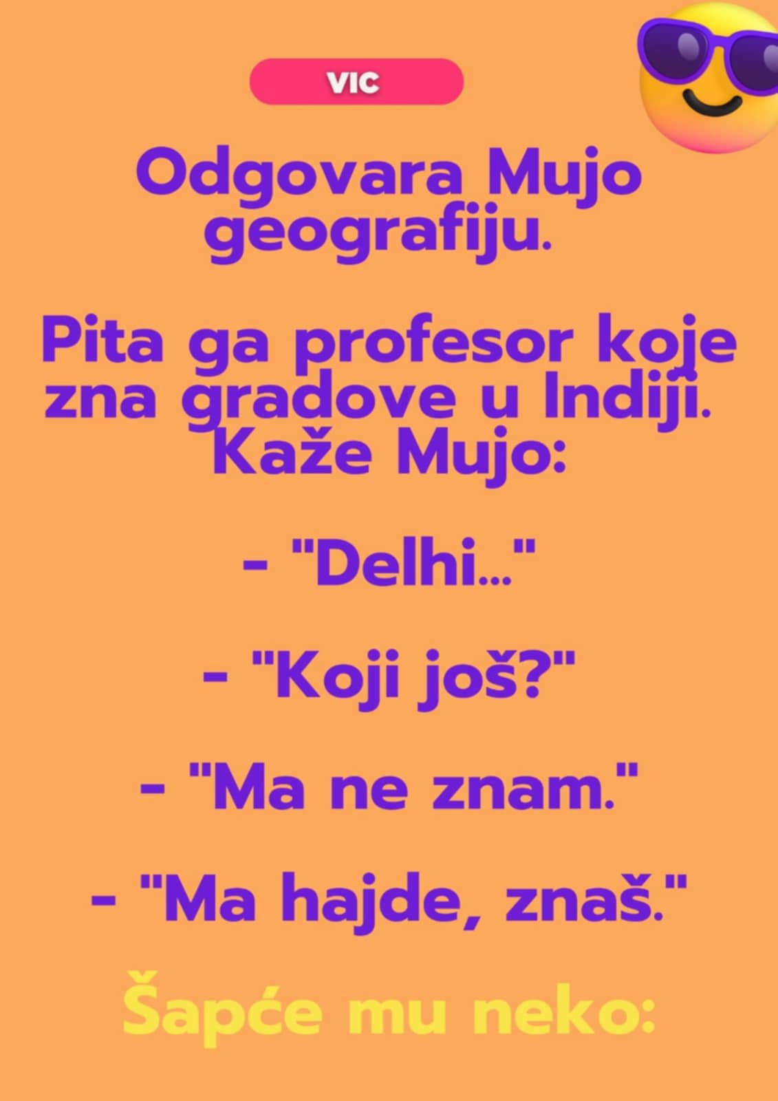 Read MoreOdgovara Mujo geografiju. Pita ga profesor koje zna gradove u Indiji. Kaže Mujo: – “Delhi…” – “Koji još?” – “Ma
